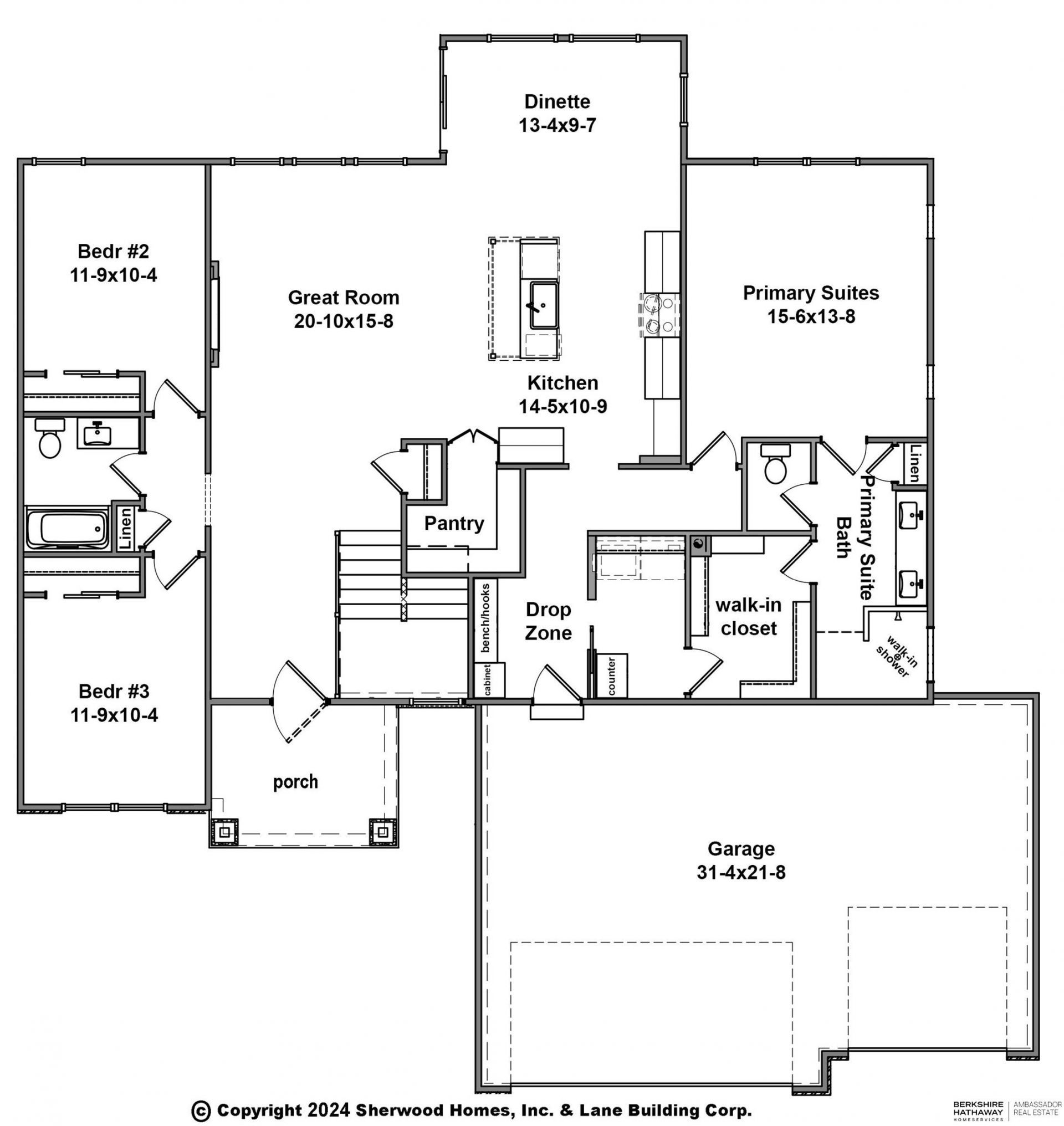 Sherwood Homes' new Allen Park Ranch plan. Beautiful front elevation with large porch and modern farmhouse accents. Very open concept with LVP flooring in much of the main floor. Huge hidden walk-in pantry in kitchen. Custom cabinetry built specifically for this house by Sherwood's cabinet shop. Gas cook top and built-in wall oven and microwave. Quartz and/or Granite counters throughout. Secluded primary suite with tiled walk-in shower and handy access to the laundry room. Drop zone at the entrance from the 3-car garage to help keep clutter in check. Storage galore with ample linen closets and generous Primary suite closet. All the latest finishes done in the most popular palette. Price includes first year ProHome comprehensive warranty plus an additional 2/10 warranty, including transferable 10-year structural warranty!